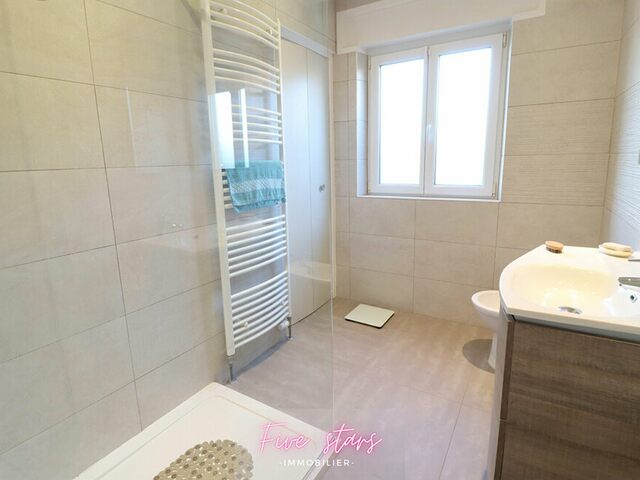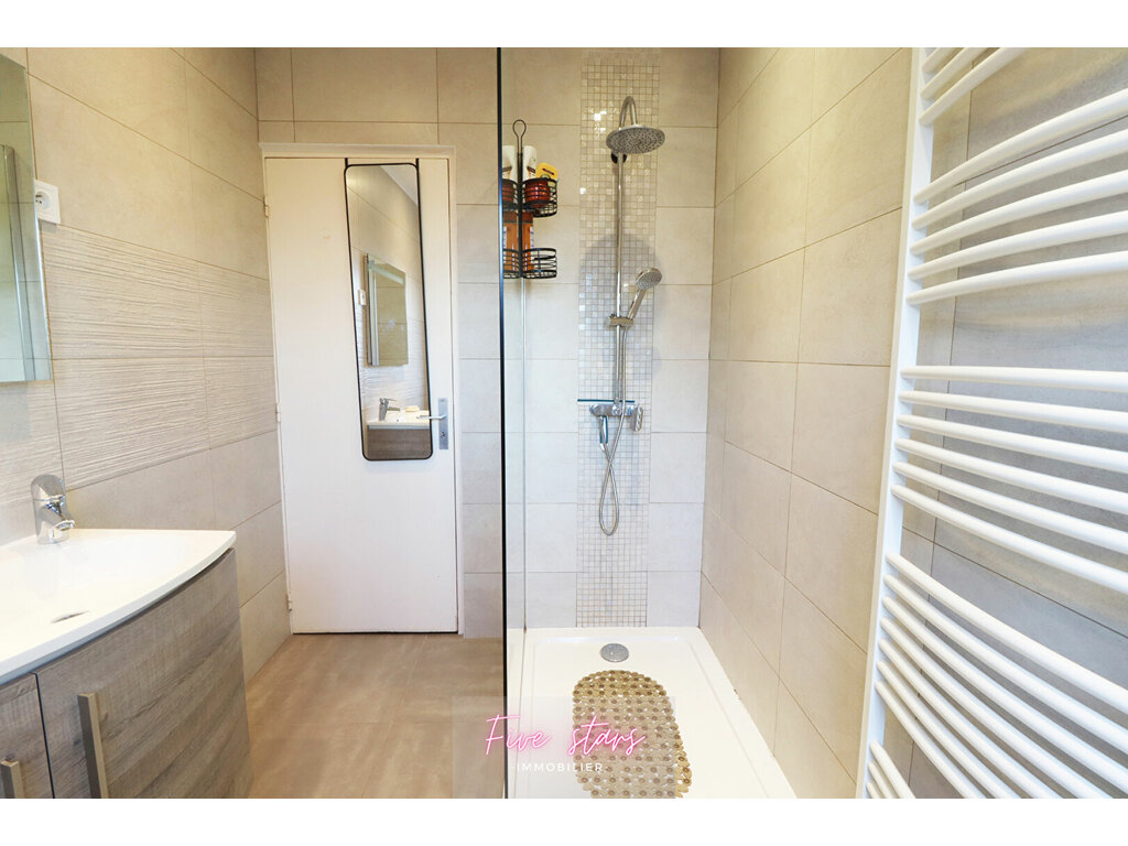 - Une salle de bain (4,90 m2) disposant d'une douche, simple-vasque, chauffe-serviette.